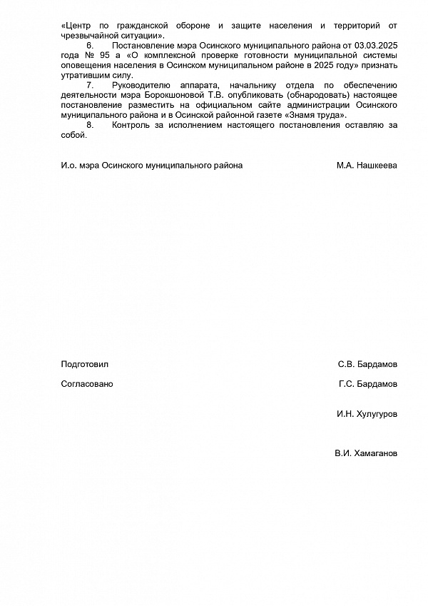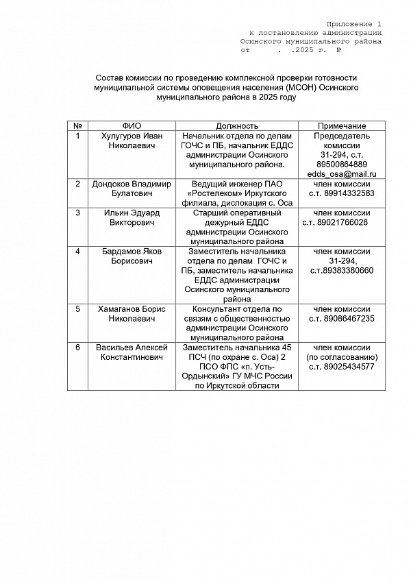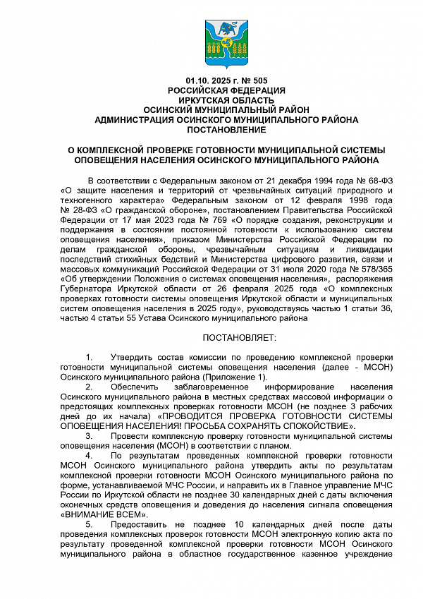 Постановление и.о. мэра от 01.10.2025 О комплексной проверке готовности муниципальной системы оповещения населения Осинского муниципального района :: Осинский район